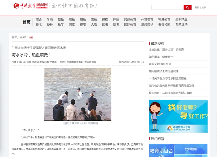 兰州大学博士生谈磊跃入黄河勇救落水者 河水冰冷,热血滚烫!