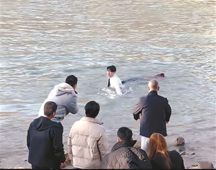 谈磊发现,落水者头朝下、四肢漂浮,似乎已完全失去意识。有路人拿出绳索尝试施救,却因距离过远始终无法套中。“再等下去,人就可能被冲得更远,救援难度会更大。”情急之下,谈磊接过绳索快速系在腰间,纵身跳入冰冷的黄河。